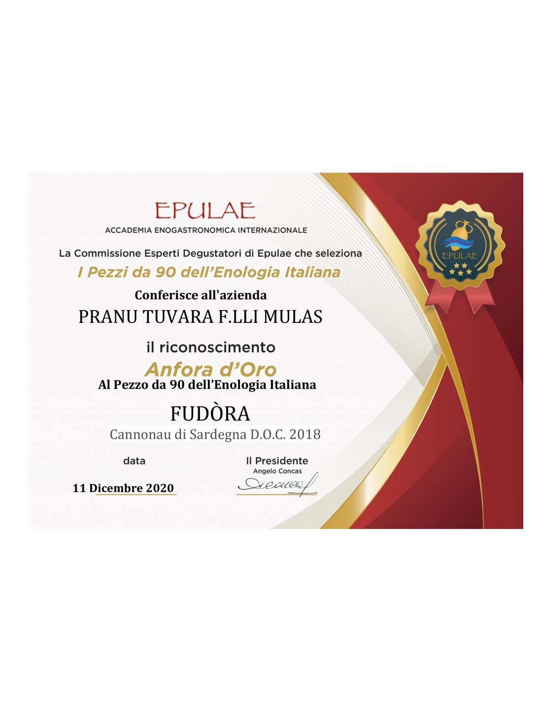 Fudòra è il Cannonau in purezza di Pranu Tuvara, proveniente dai vigneti scistosi di Cardedu. Di colore rosso rubino traslucido, offre profumi di ciliegia, amarena, fiori rossi ed erbe mediterranee, con un elegante tocco speziato. Al palato è secco, caldo e morbido, con buona struttura, freschezza equilibrata e un finale persistente e sapido.